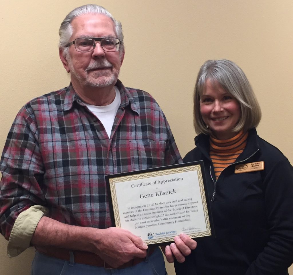 At our regular December board meeting, we honored GENE KLISNICK for his many years of service as a Director of the Foundation. Gene is always generous with his time and talents and we look forward to his continued support and appreciate his efforts to preserve and enhance Boulder Junction.