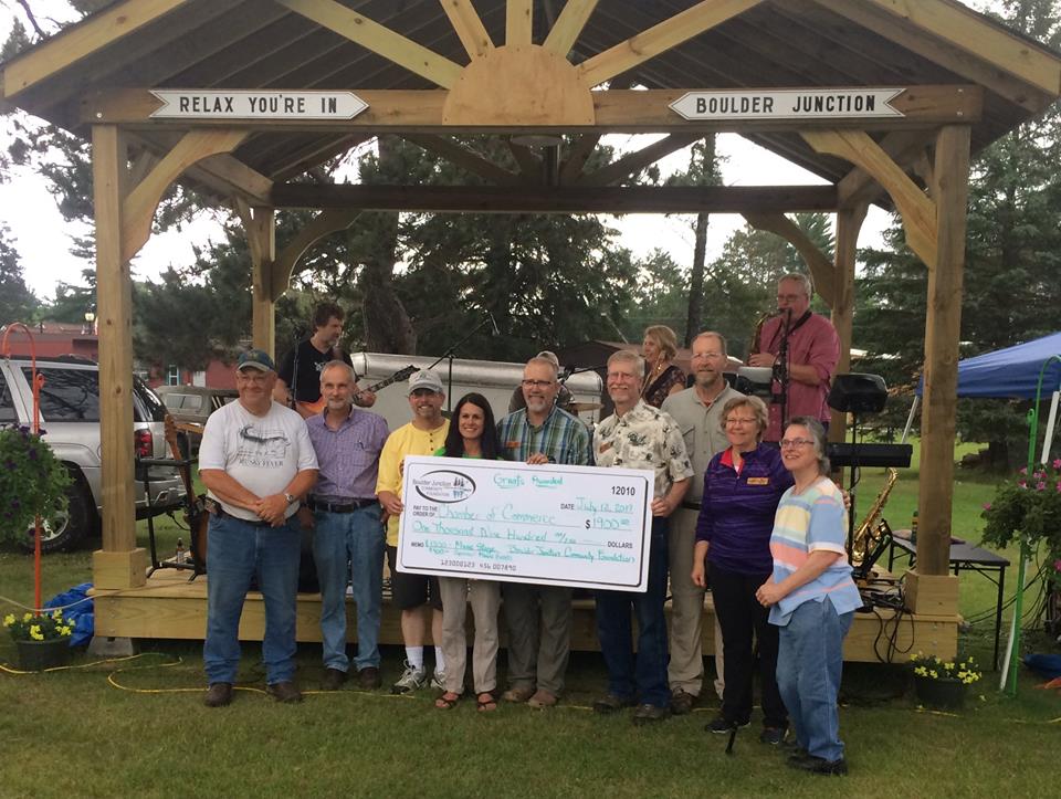 The Boulder Junction Community Foundation awarded the Boulder Junction Chamber of Commerce two grants on July 12, 2017. Before Music on Main Street began that evening, the Foundation presented the Chamber a grant in the amount of $400 to help support the funding of artists performing at the weekly summer music series. The series expanded from six Wednesday evening performances to eight performances this year. The Chamber also received a grant in the amount of $1500 which helped fund the building of a new stage used for Music on Main Street. The stage which is back dropped by beautiful pine trees is a much-needed addition to this event, providing shelter from the elements for the artists who perform. Individual and business donations as well as grants help to support this event which is now in its 10th season.
