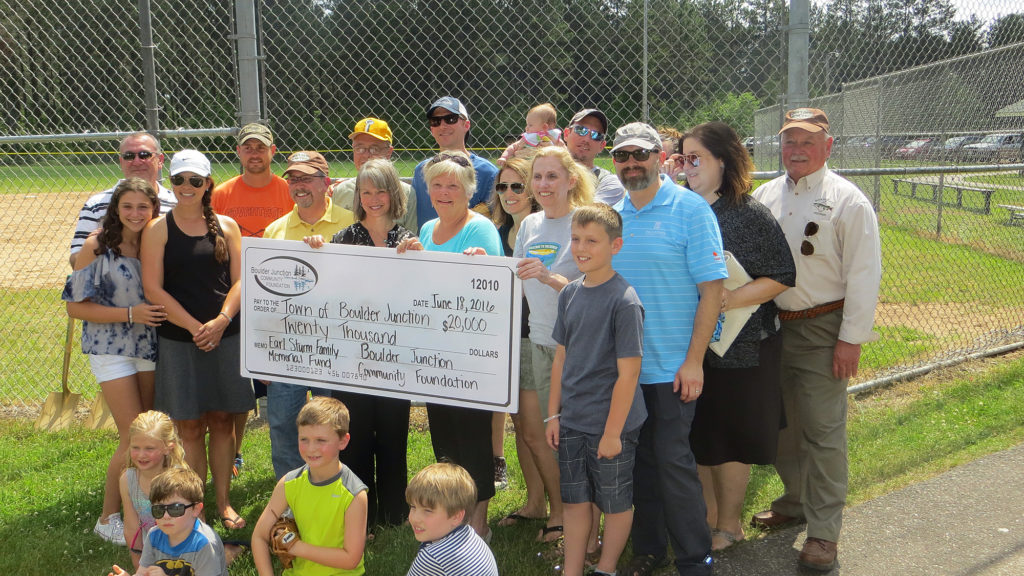 In honor of longtime resident Earl Sturm, and in recognition of his great love of baseball and softball, Earl’s family donated memorial funds to the Boulder Junction Community Foundation to be designated for improvements to Boulder Junction’s Community Sports & Recreation area located off Highway M South. On Saturday, June 18, a dedication ceremony took placed at the ball park facilitated by Town Park Board Supervisor Dennis Duke and Community Foundation President Barbara Boston. The foundation had received $20,000 from the family designated for improvement of, and benefit to, the Baseball Field located at the Boulder Junction ball park. Additional checks were received by the Foundation at the ceremony representing money donated by Earl’s grandchildren for further improvements to the field.
